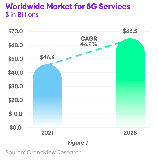 Probably the most significant trend impacting the telecom industry is the roll-out of 5G networks. Telecommunication companies have invested and will continue to invest heavily in 5G because it brings faster speed, lower latency, increased availability, and greater capacity to mobile networks. This capability is critical as people become increasingly dependent on mobile devices and demand high-quality and highly reliable wireless network communications. 5G also makes Augmented Reality, IoT, Edge Computing, and other disruptive technologies possible. According to Grandview Research, 5G services represented a $46.6 Billion global market in 2021. Grandview predicts this market will reach $66.5 Billion by 2028.