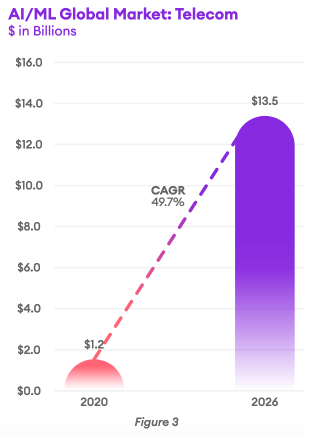 With consumers demanding rapid response through an Uber-like CX, telcos cannot afford not to implement AI/ML tools. The market for AI within the Telecommunication Industry will reach $13.5 Billion globally by 2026. According to Valuates Reports, this figure is up from $ 1.2 Billion in 2020.